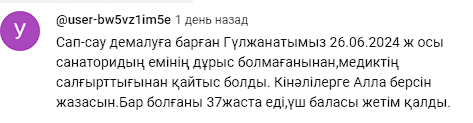 Наша Гульжанат, вполне здоровая, пришла на этот санаторий 26 июня 2024 года. Из-за неправильности санаторного лечения и из-за халатности медика, она умерла. Да накажет виновных Аллах.